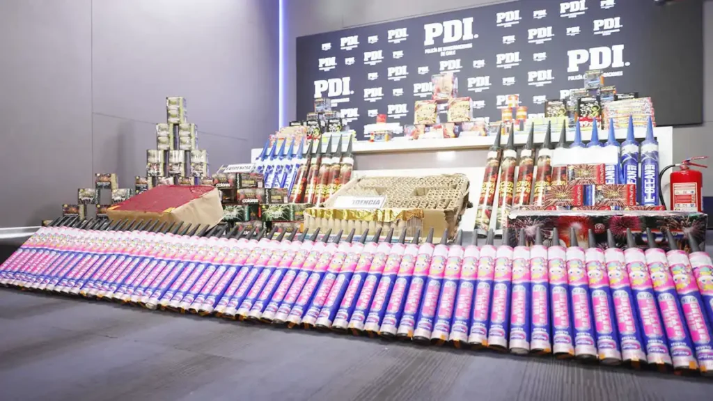 La detención del proveedor se realizó en la comuna de Estación Central, en la Población Los Nogales, donde se ubicaron dos domicilios utilizados como centros de acopio. En estos lugares, se logró la incautación de una gran cantidad de fuegos artificiales, cuya venta y tenencia están prohibidas por la Ley 17.798, sobre Control de Armas y Explosivos. El avalúo de las especies incautadas asciende aproximadamente a $40. millones.
